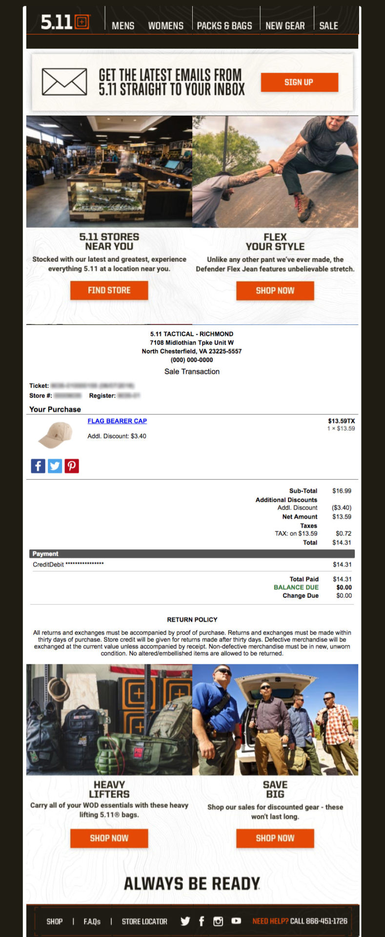 5.11 Tactical set goals to increase their in-store email address capture rate to 50% and create a remarkable omnichannel experience for their customers. To do this, they wanted to focus on raising their email capture rate at the point of sale by constructing a consistent look and feel across transactional and marketing communications. Read about how Rob Lauzon, Director of IT Omnichannel Solutions, deployed flexEngage to help 5.11 Tactical hit their goals with their retail receipts.