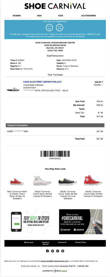 Shoe Carnival elected to send both versions of the receipt at the register to keep their omnichannel strategy in mind while mitigating concerns about the digital receipt's ease of access. The lift for this change at the POS proved to be of no issue with the current partner in digital receipts, flexEngage. Upon launch, Shoe Carnival saw a 37% jump in digital receipt adoption rate, the conversion rate rose by 56%, and incremental sales saw a 70% increase. This allowed Shoe Carnival to successfully transition many of their best customers from in-store to online, while adding anther engagement opportunity for them.